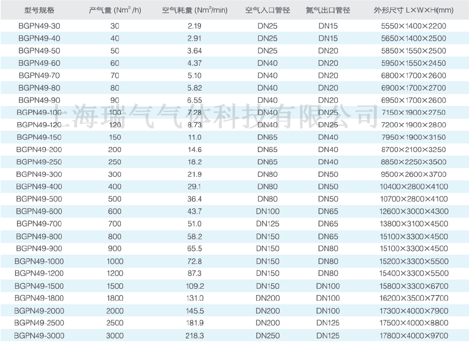 瑞氣BGPN系列分子篩制氮設備根據(jù)氮氣純度分為十種型號,即:BGPN97、BGPN98、BGPN99、BGPN295、BGPN39、BGPN395、BGPN49、BGPN495、BGPN59、BGPN595。