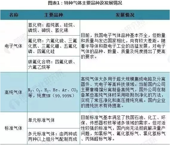 目前,從應用領域劃分,特種氣體主要有電子氣體、高純氣體、標準氣體三種,具體品種及發(fā)展情況如下。