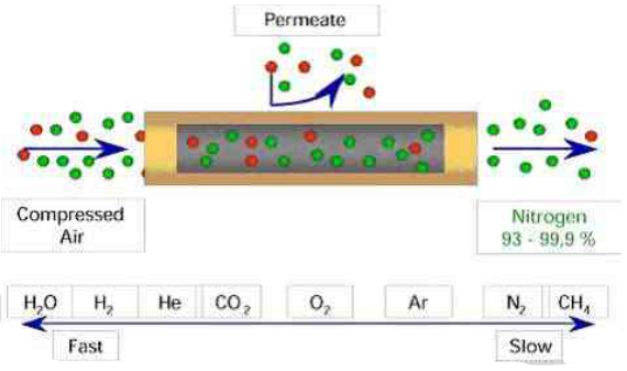膜制氮機是一種新型的空分設備,該設備以空氣為原料,中空纖維膜為分離器,利用氧和氮在膜中相對滲透速率不同的特性,在常溫高壓下工作,得到連續(xù)、穩(wěn)定的氮氣。
