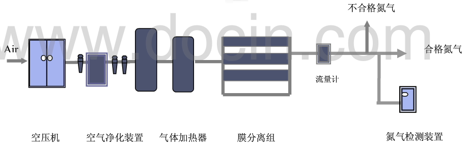 瑞氣膜分離制氮機由以下幾部分組成:壓強空氣氣源(空壓機)、壓縮空氣凈化組件、氣體加熱裝置、中空纖維膜組、氮氣檢測系統(tǒng),簡要流程示意圖如下:
