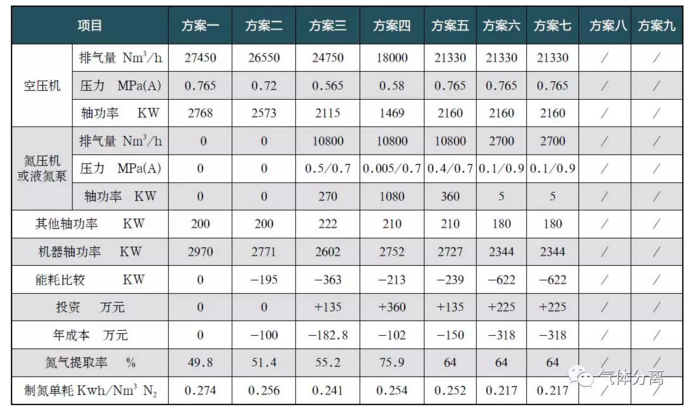 方案5是在方案1與方案4組合出來的一種流程形式,其提取率高,能耗一般,操作較復(fù)雜。主要的優(yōu)勢是可以同時生產(chǎn)兩種氮氣產(chǎn)品。