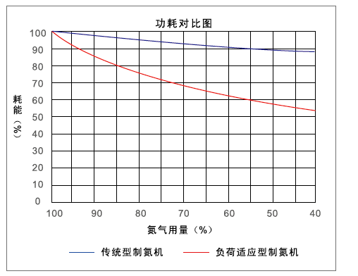 先進(jìn)的負(fù)荷適應(yīng)功能對變工況運(yùn)行實(shí)現(xiàn)進(jìn)一步節(jié)能,針對用戶用氣不穩(wěn)定工況,根據(jù)分子篩的特性,在保證氮?dú)庑阅芊€(wěn)定的情況下,有效減少單位時(shí)間內(nèi)富氧氣體排放次數(shù),減少原料空氣的消耗,減少生產(chǎn)成本,以達(dá)到負(fù)荷自動(dòng)適應(yīng)的節(jié)能作用。