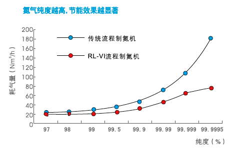 降低原料空氣消耗,確保吸附塔床層氮氣純度分布連續(xù)性,提高碳分子篩的產氮效率,改變了利用變壓吸附技術不能制取高純氮氣(99.9995%)的歷史。減輕壓縮空氣凈化單元負載,提高原料壓縮空氣預處理效果,確保碳分子篩性能指標。氮氣純度越高,節(jié)能效果越明顯。