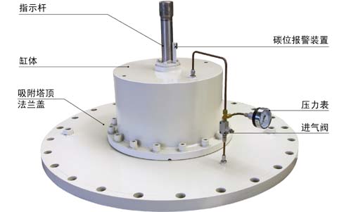 新型獨創(chuàng)的氣缸壓緊裝置,儀表氣直接取之于吸附塔,任何狀態(tài)下,氣缸內壓力始終為吸附塔的最高壓力,不受吸附塔內壓力變化的影響,確保分子篩始終處于被壓緊狀態(tài)。壓緊裝置中設置了限位沉降式報警系統(tǒng),當氣缸活塞行程達到下限行程時,設備控制系統(tǒng)自動產生聲光報警;當氣缸活塞到達極限行程時,設備自動停機,等待檢修。本氣缸具有方便檢測,可靠性強等優(yōu)點。